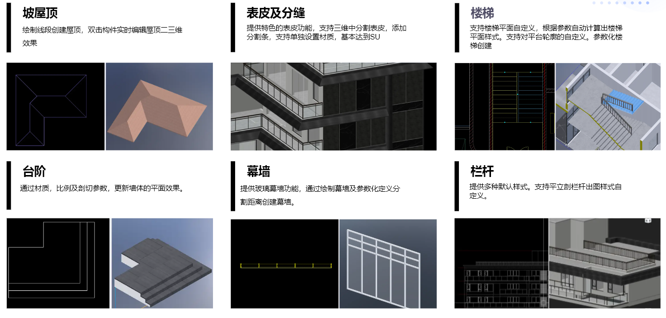 提供楼板、降板、开洞、坡道、栏杆扶手、坡屋顶、立面造型(拉伸体)、各类楼梯等基础设计工具,为建筑设计奠定坚实基础。
